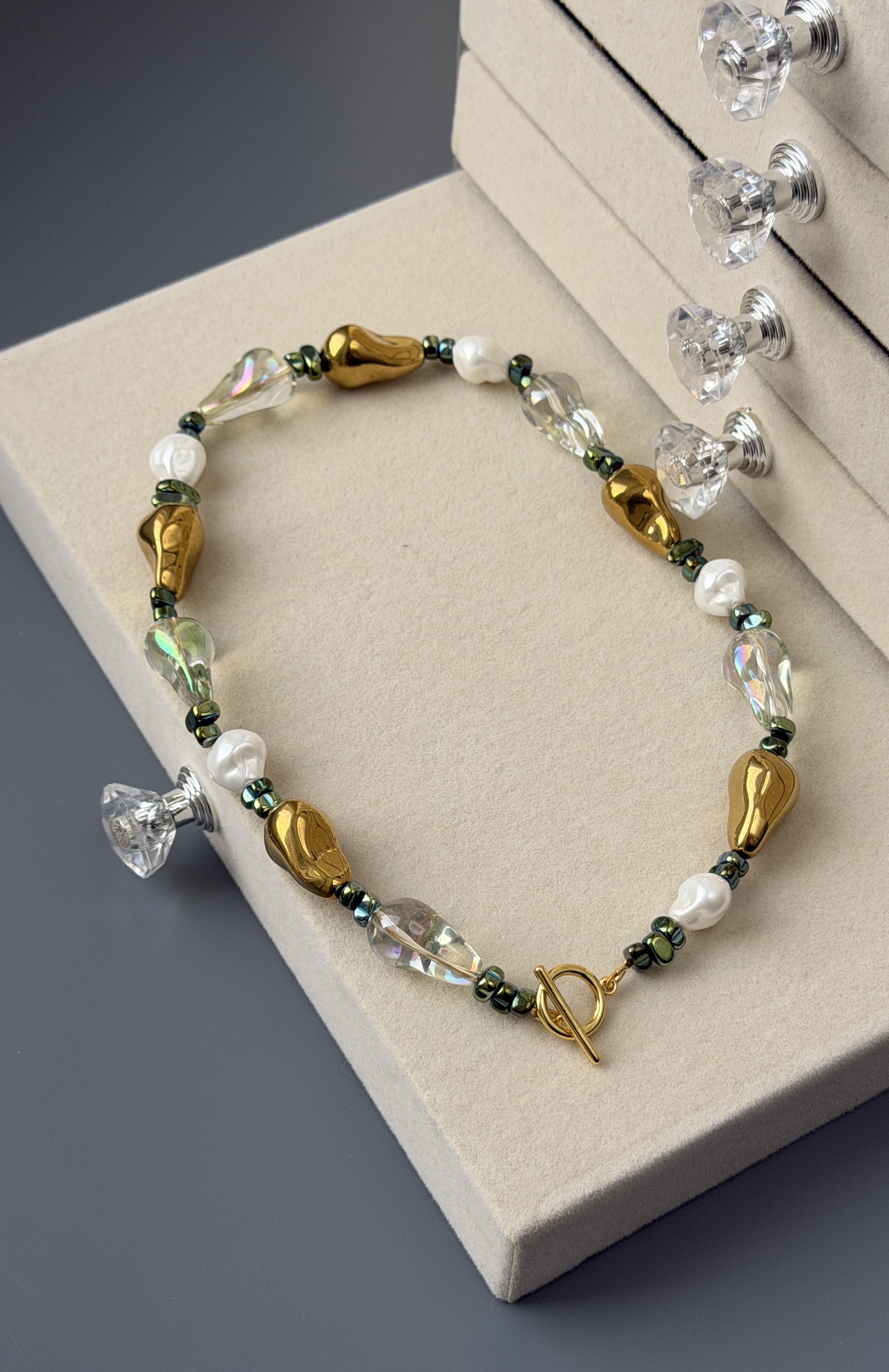 Барочные жемчужины Майорка добавляют живость и естественную асимметрию форм, а переливы хрусталя ловят свет и наполняют украшение лёгким свечением. Золотистые акценты придают образу благородство и теплоту, делая колье заметным, но не перегруженным.