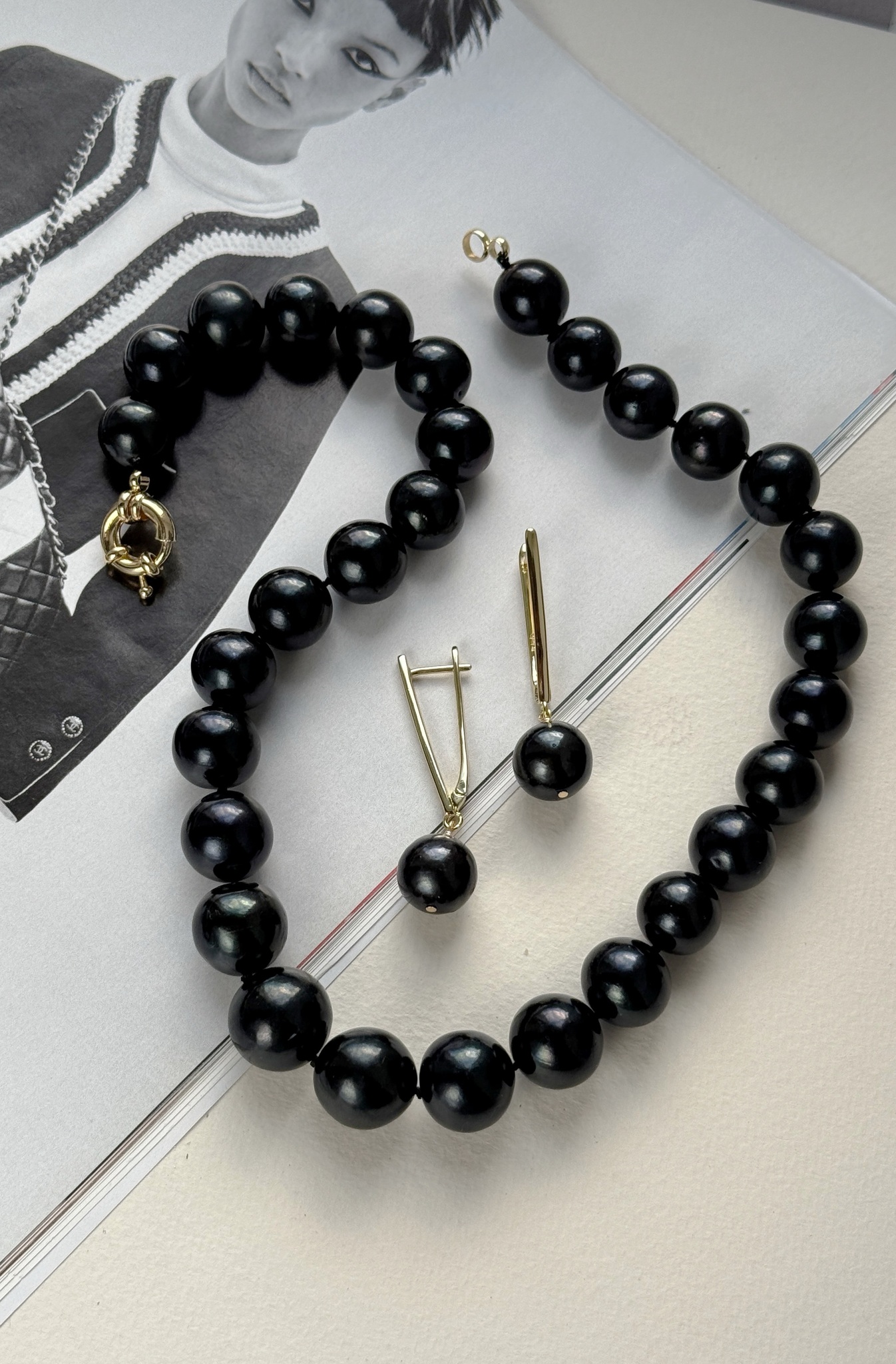 Глубокий блеск черного жемчуга подчеркивает вашу стать и внутреннюю силу, а классическая форма делает комплект универсальным спутником как для деловых встреч, так и для особых случаев.