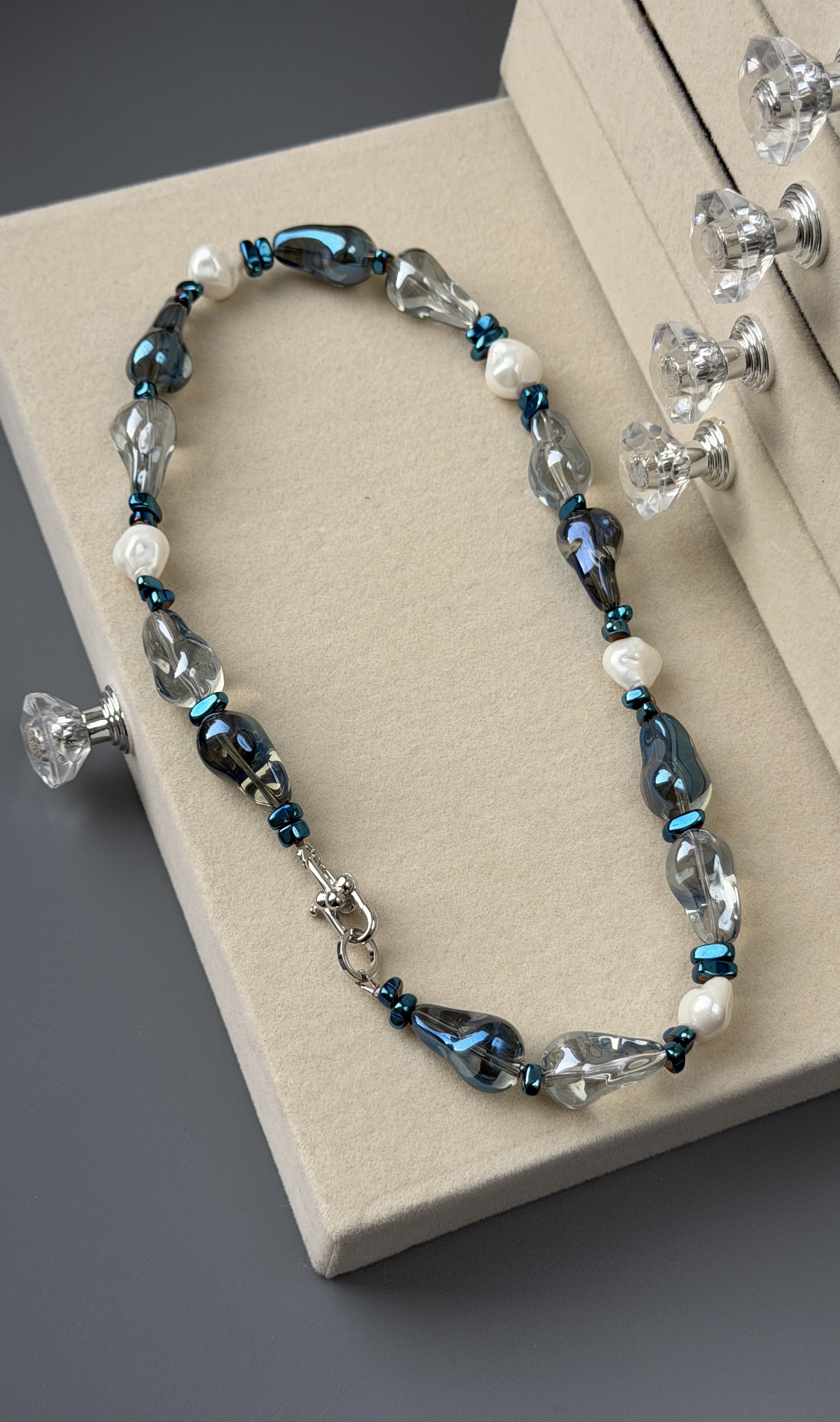 В композиции сочетаются три фактуры - холодный блеск гематита, чистота хрусталя и нежное перламутровое сияние бусин Майорка в форме барочных жемчужин. Причудливые формы бусин придают колье живой характер и ощущение естественности, а прозрачные и дымчатые оттенки создают глубину и игру света при каждом движении.