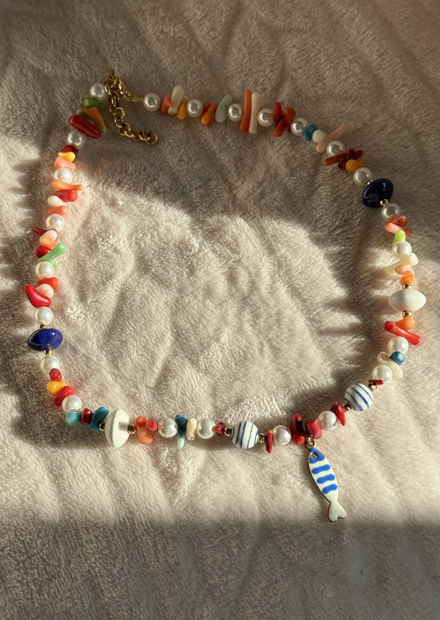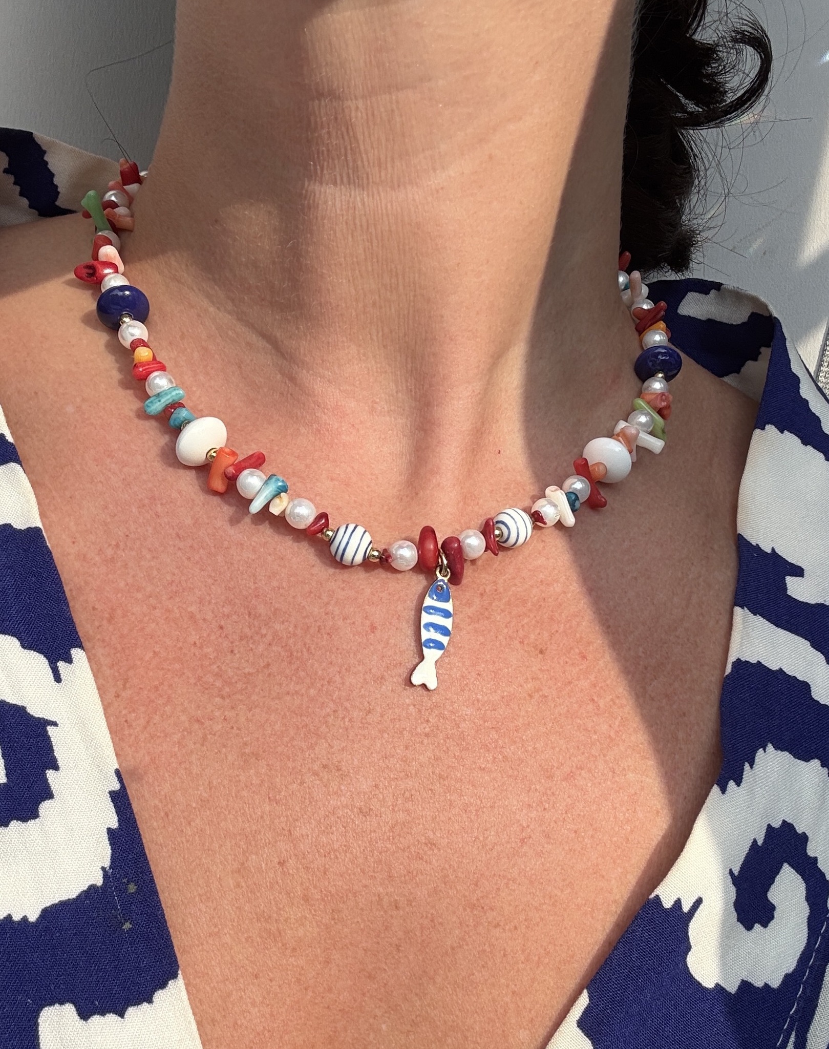 Каждая деталь тщательно продумана: керамические бусины с ручной росписью, натуральные перламутровые вставки, имитирующие кораллы, и символ в виде рыбки делают украшение по-настоящему особенным. Такое колье станет идеальным акцентом для летнего образа и дополнит любой стиль — от непринуждённого пляжного до элегантного вечернего.