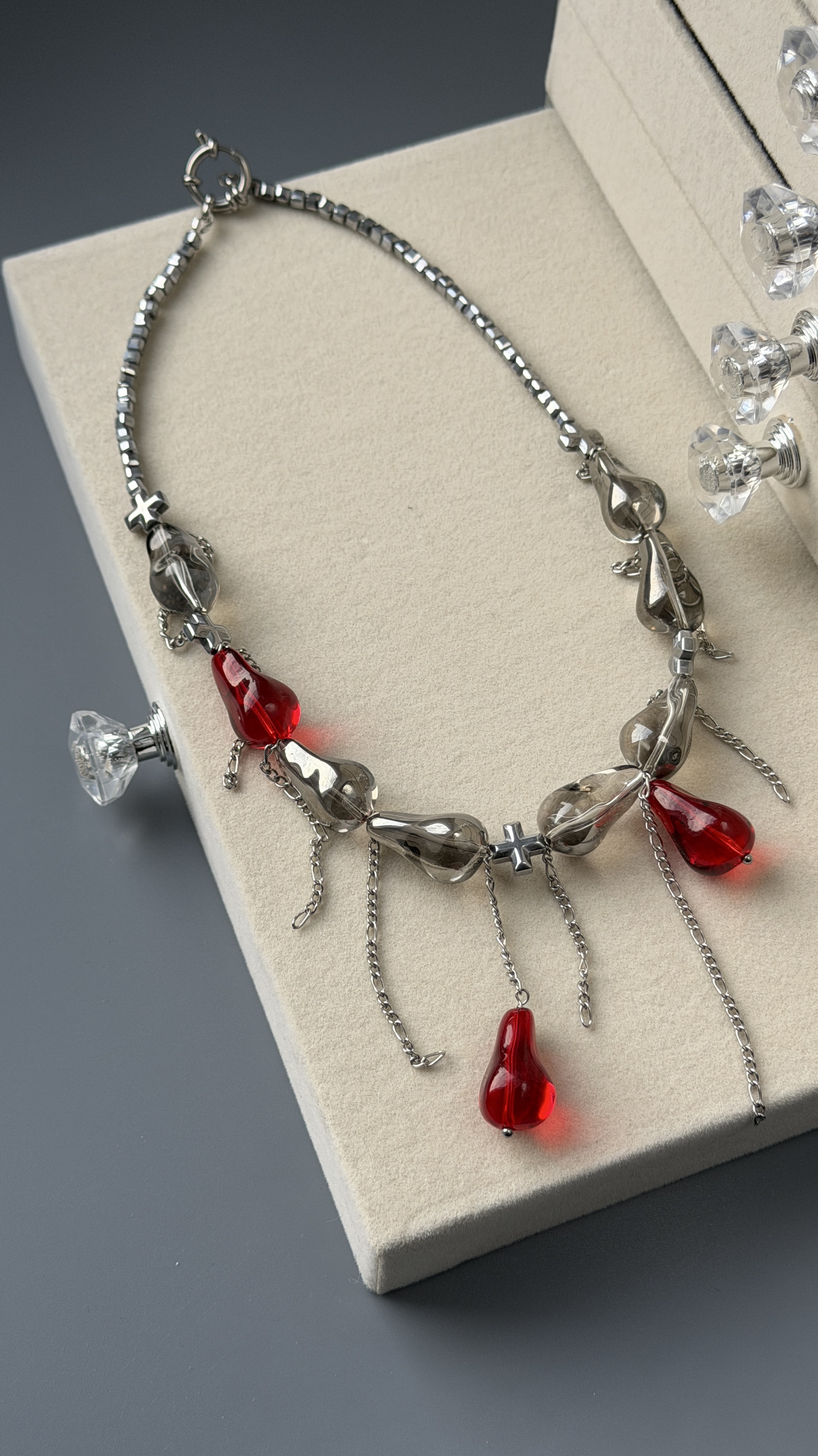 Колье «Страсть» - украшение с характером и смелым настроением. Контраст прозрачных дымчатых форм и насыщенных алых акцентов притягивает взгляд и создает эффект внутреннего огня. Холодный металлический блеск фурнитуры усиливает драматичность образа и делает композицию особенно выразительной.