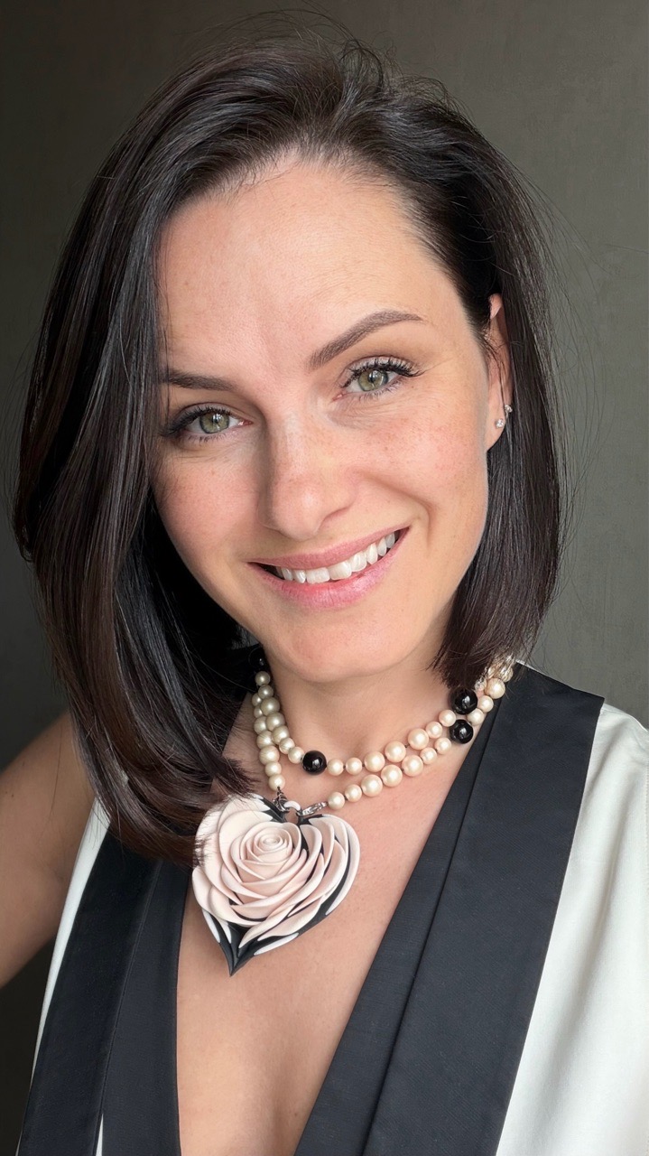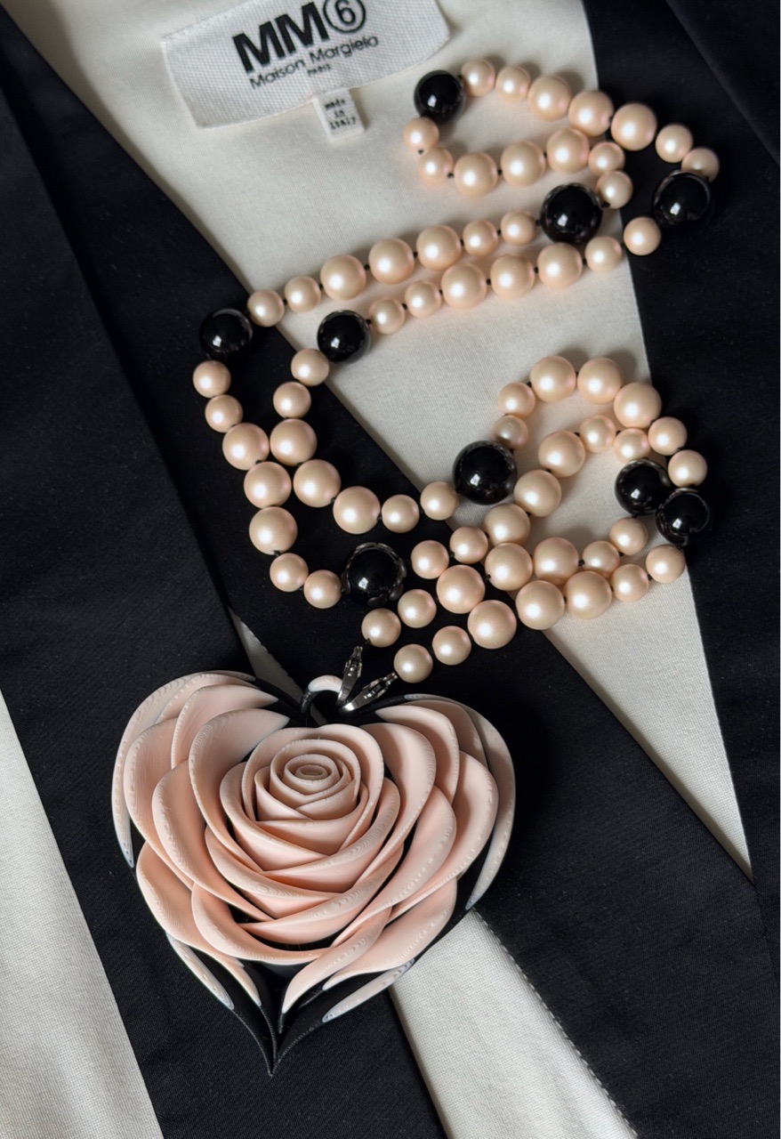 Классическая жемчужная нить из Майорки, собранная в стиле «шан*ль», с дерзким сердцем из лепестков - словно роза, которая решила больше не быть идеальной.