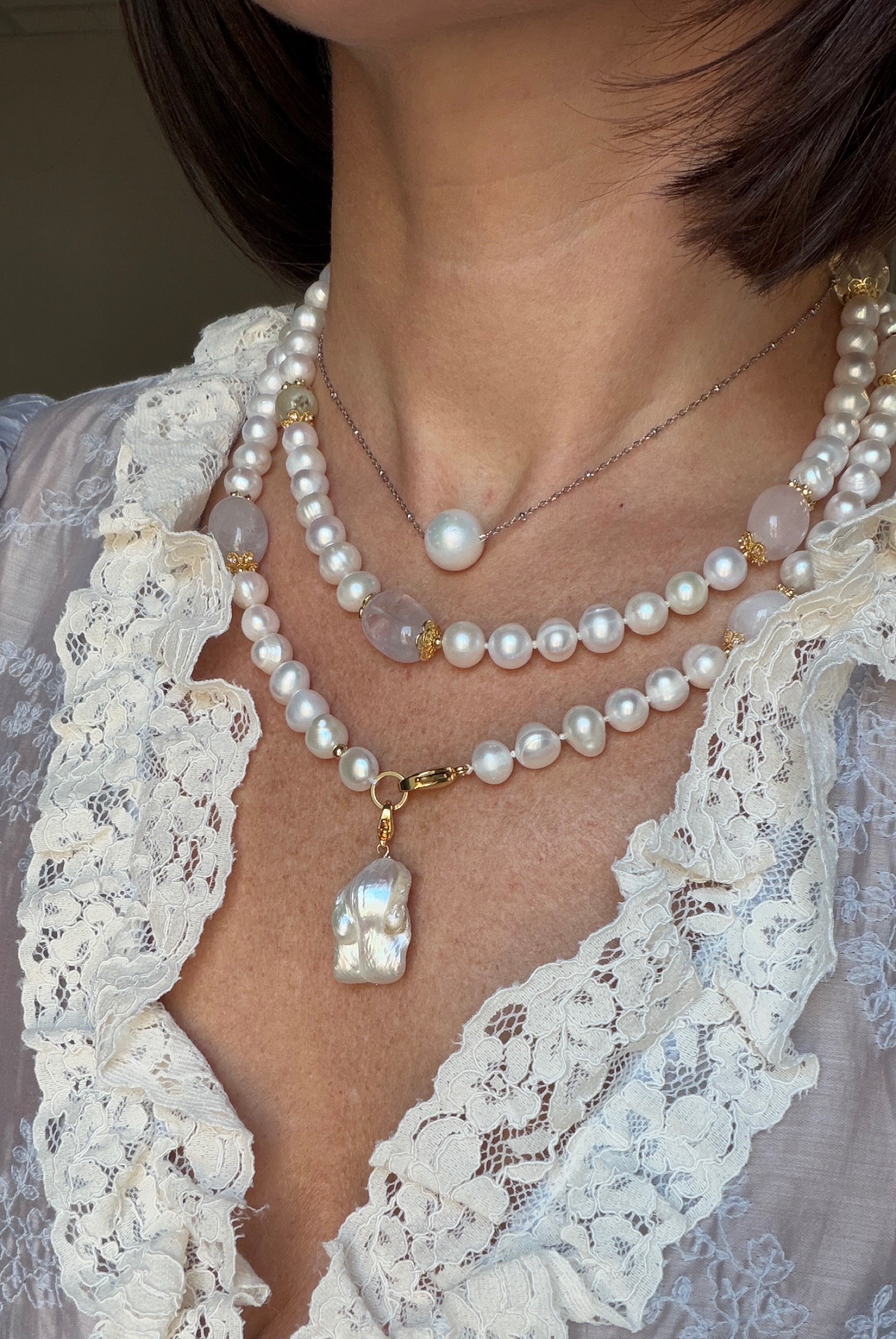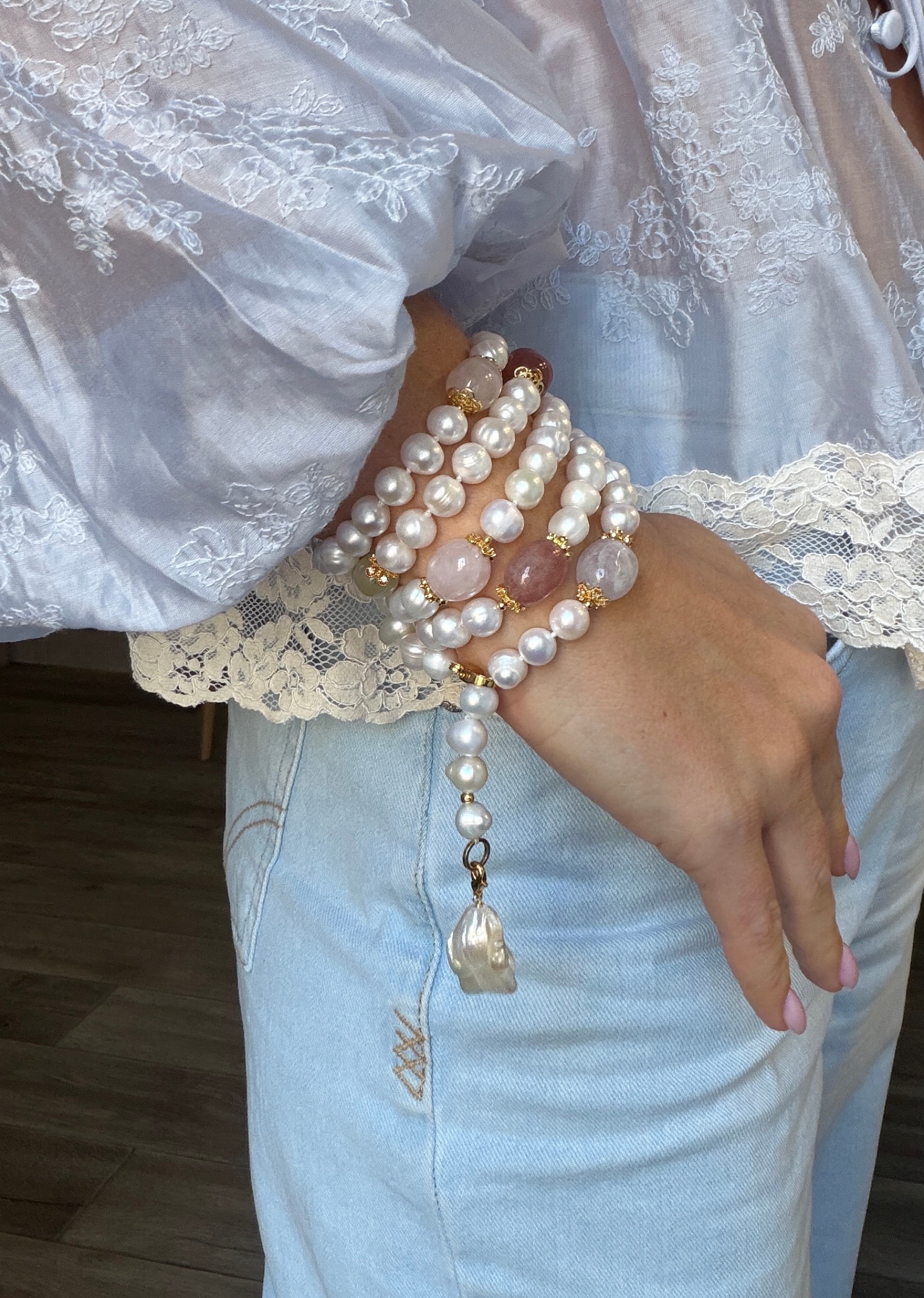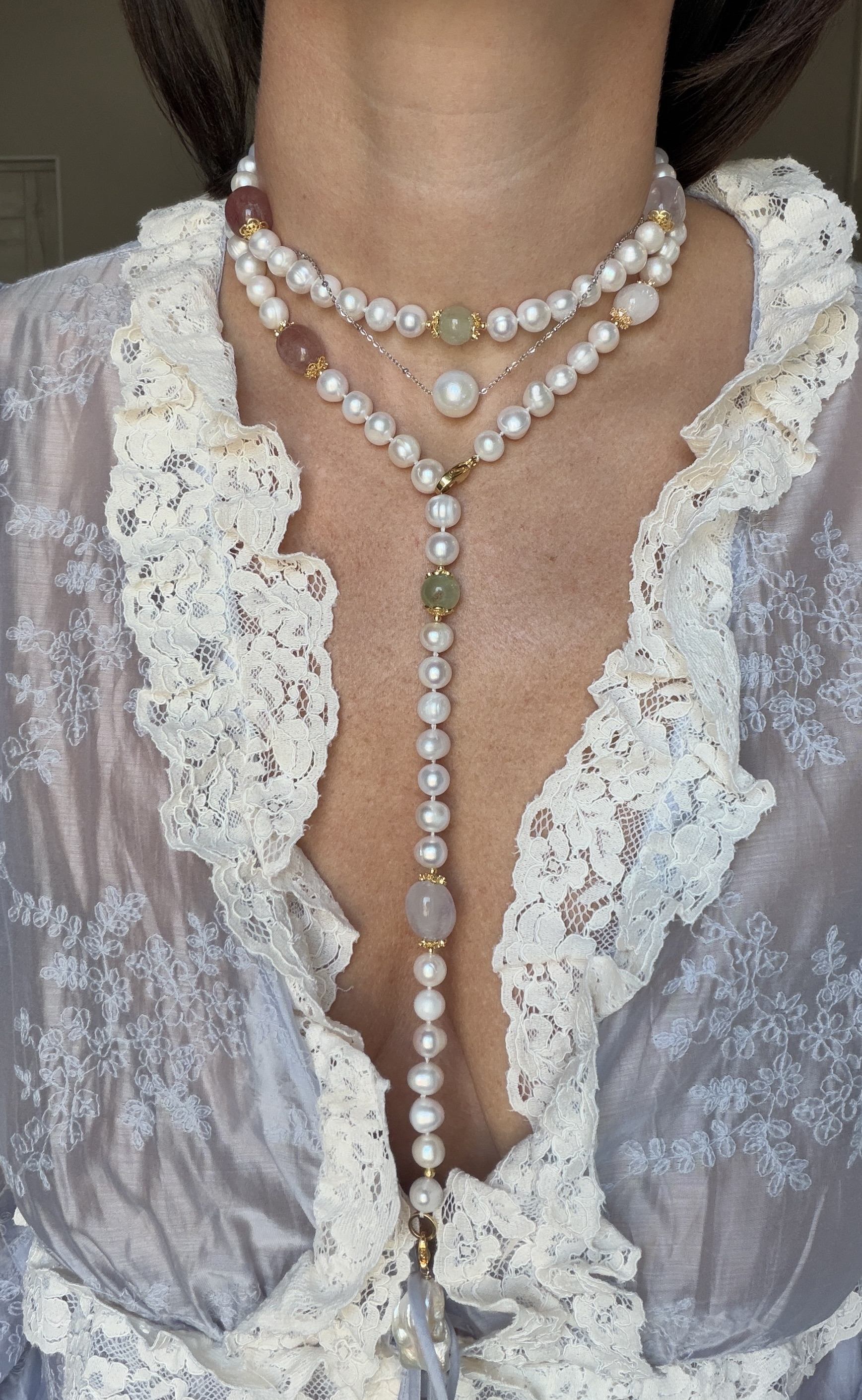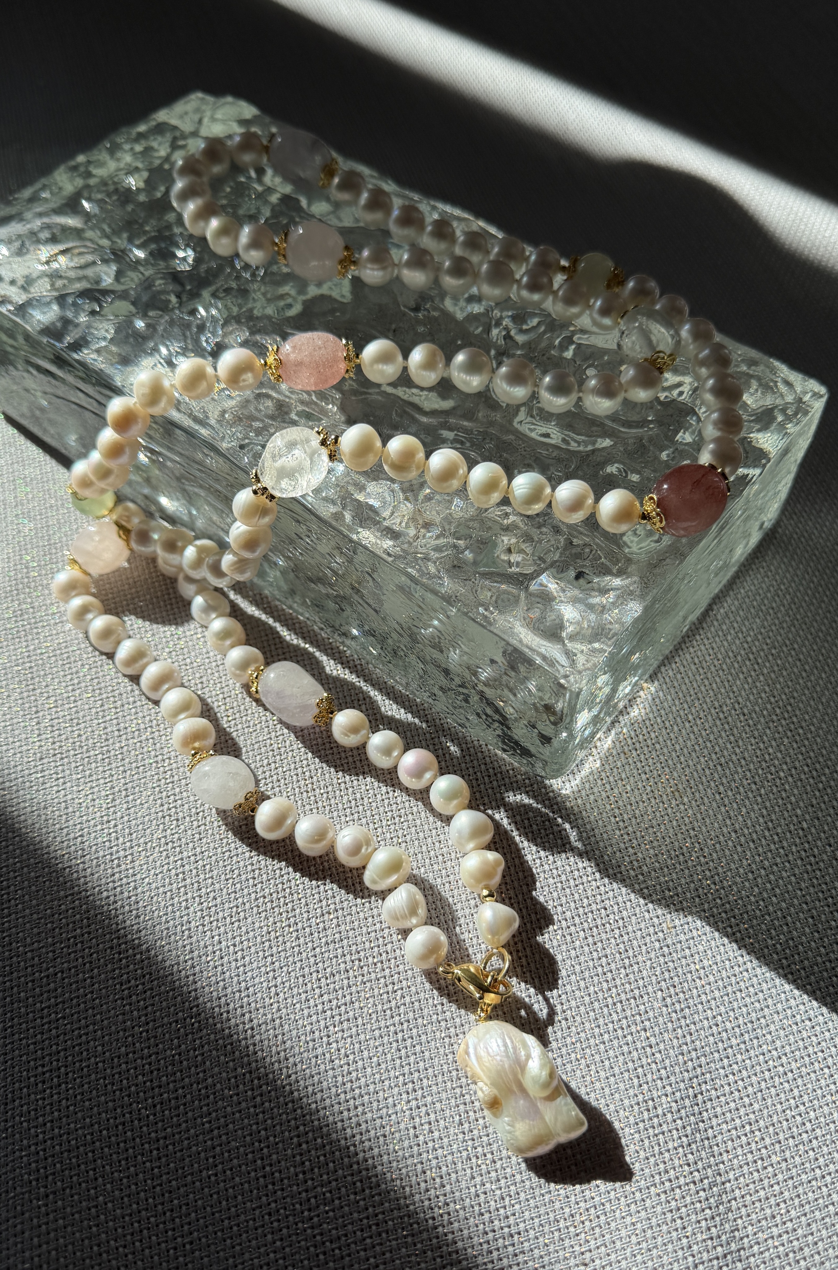 Натуральный жемчуг в сочетании с природными камнями - розовый кварц, горный хрусталь, аметист, белый кварц и пренит - собираются в одну цельную композицию, но каждый раз звучат по-разному.