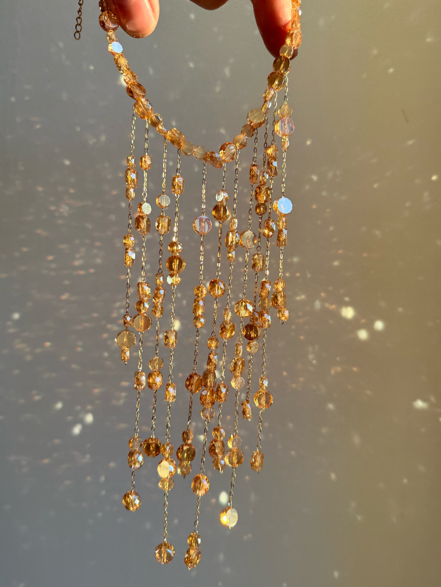 Это колье создано, чтобы дарить вам настроение света и радости каждый день. Легкие нити, усыпанные хрустальными бусинками, переливаются мягкими бликами при каждом движении, создавая ощущение природного водопада и волшебного праздника.