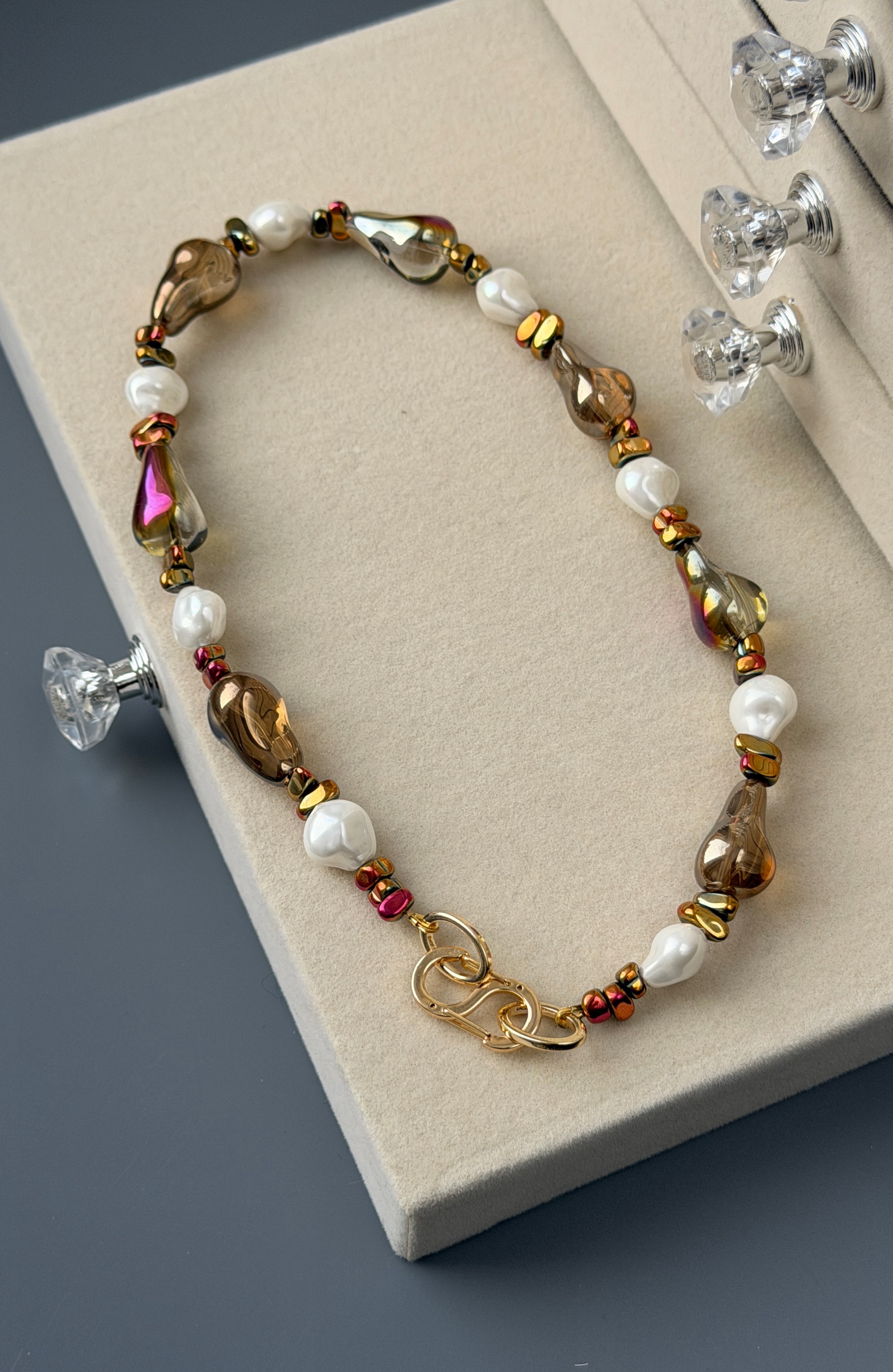Колье «Желание» - украшение с теплым характером и притягательной игрой оттенков. Медовые и карамельные переливы хрусталя сочетаются с барочными жемчужинами Майорка и золотистыми акцентами, создавая ощущение глубины и мягкого сияния.