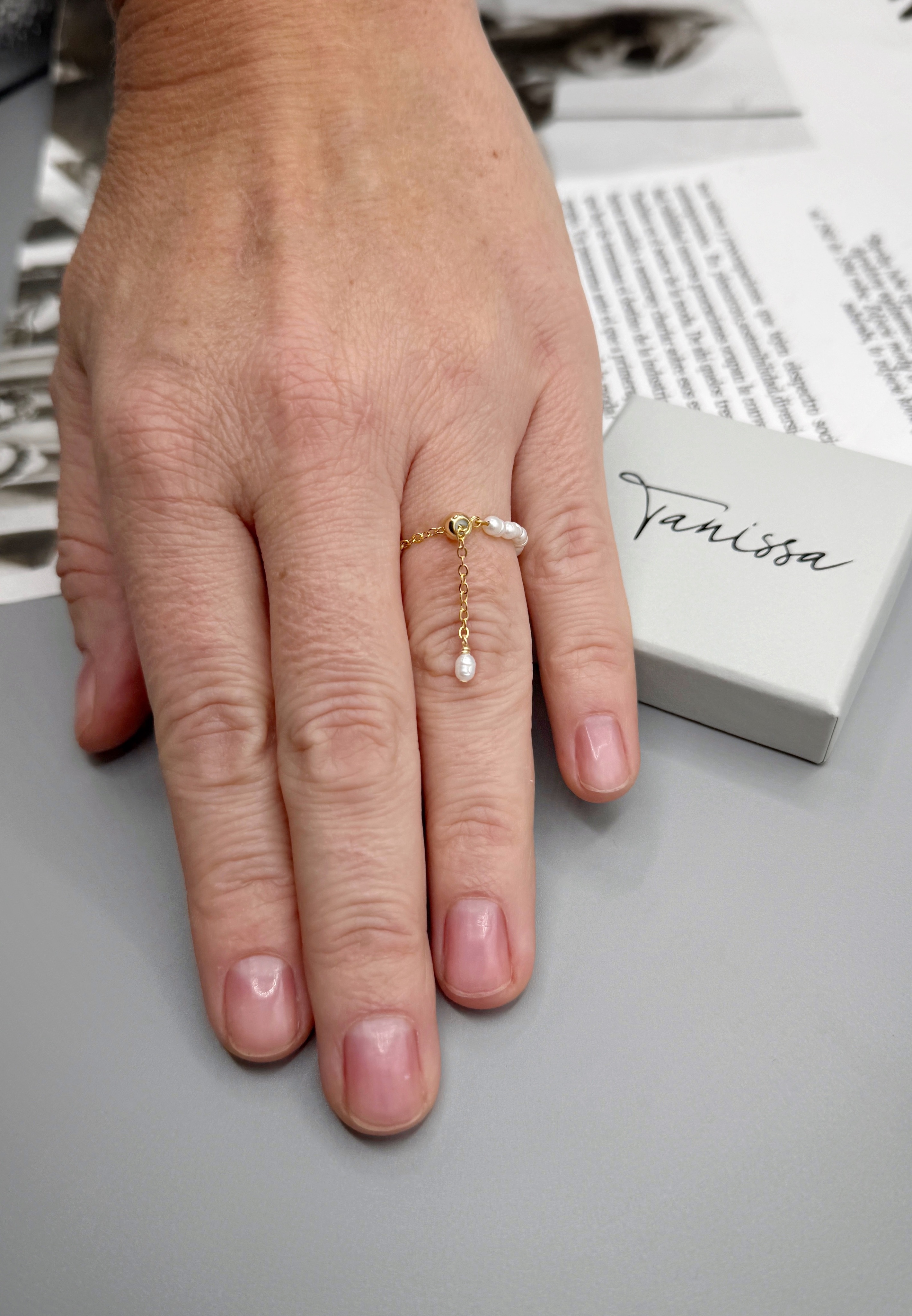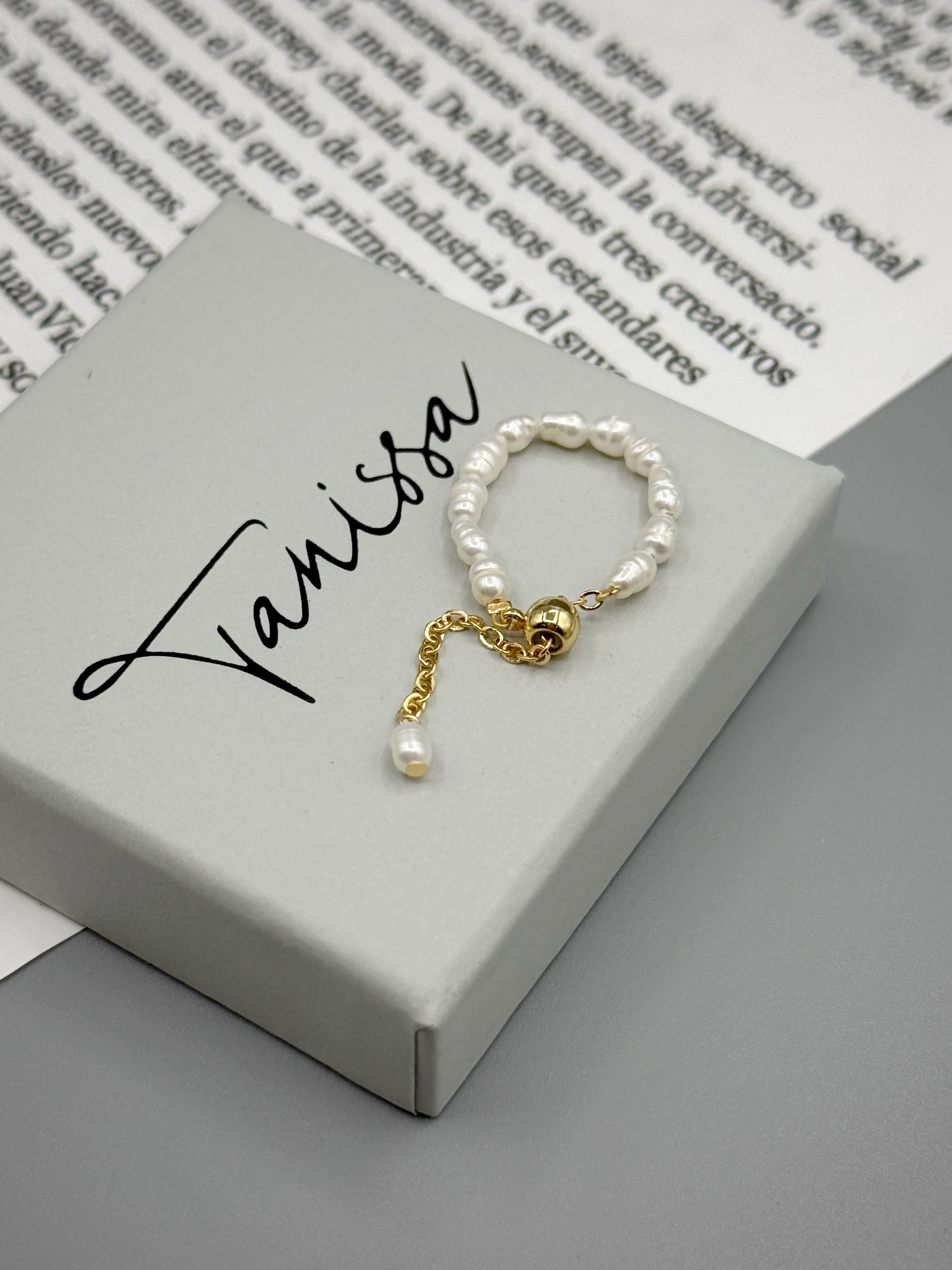 Лаконичное и женственное кольцо, созданное из мелкого речного жемчуга и дополненное регулируемой вставкой, позволяющей носить его комфортно на любом пальце.