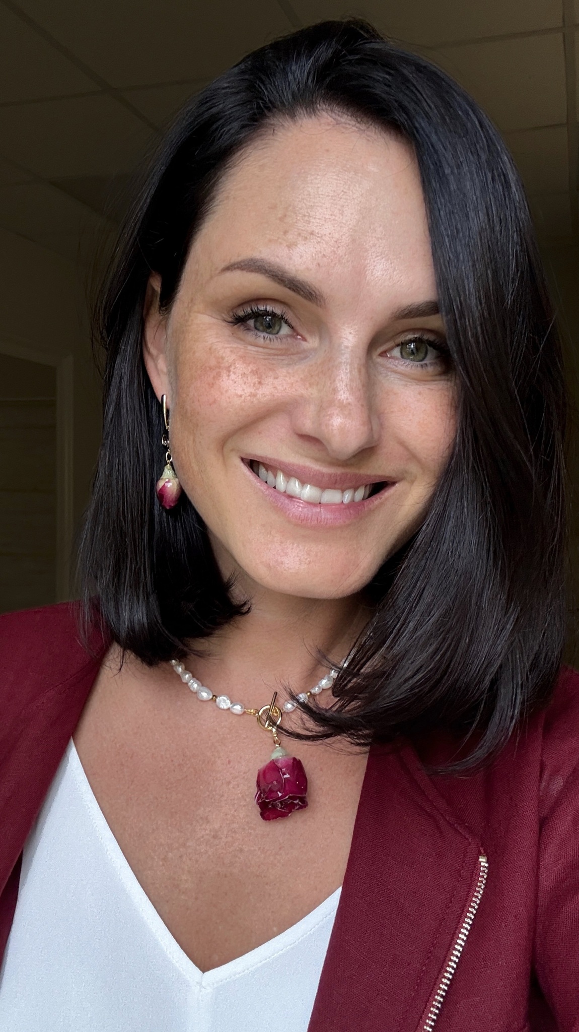 Подвеска на колье съёмная, и вы можете легко адаптировать образ под настроение: носить лаконичное жемчужное ожерелье или добавить романтичный акцент в виде розы. Серьги гармонично дополняют композицию, добавляя изящества и тонкого сияния.