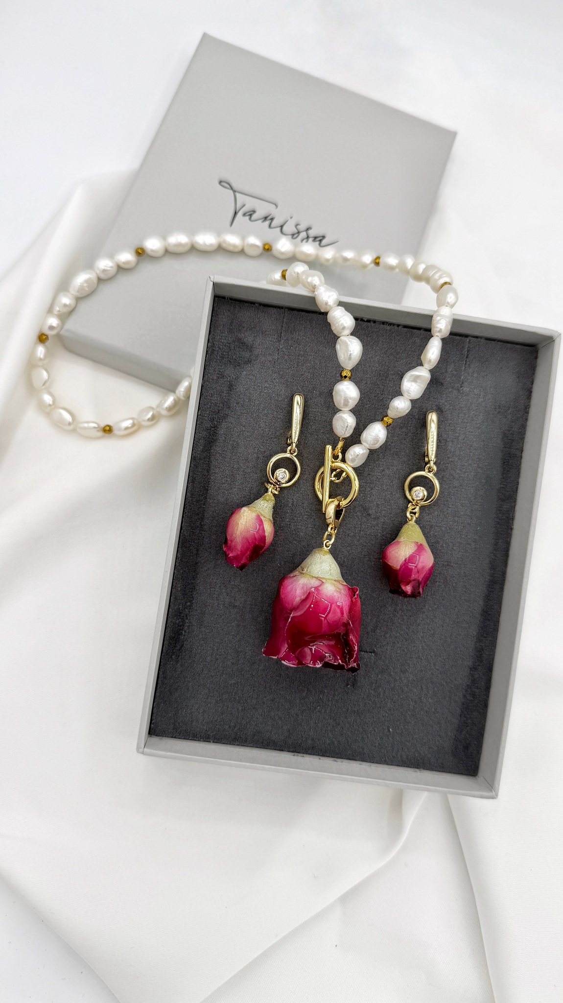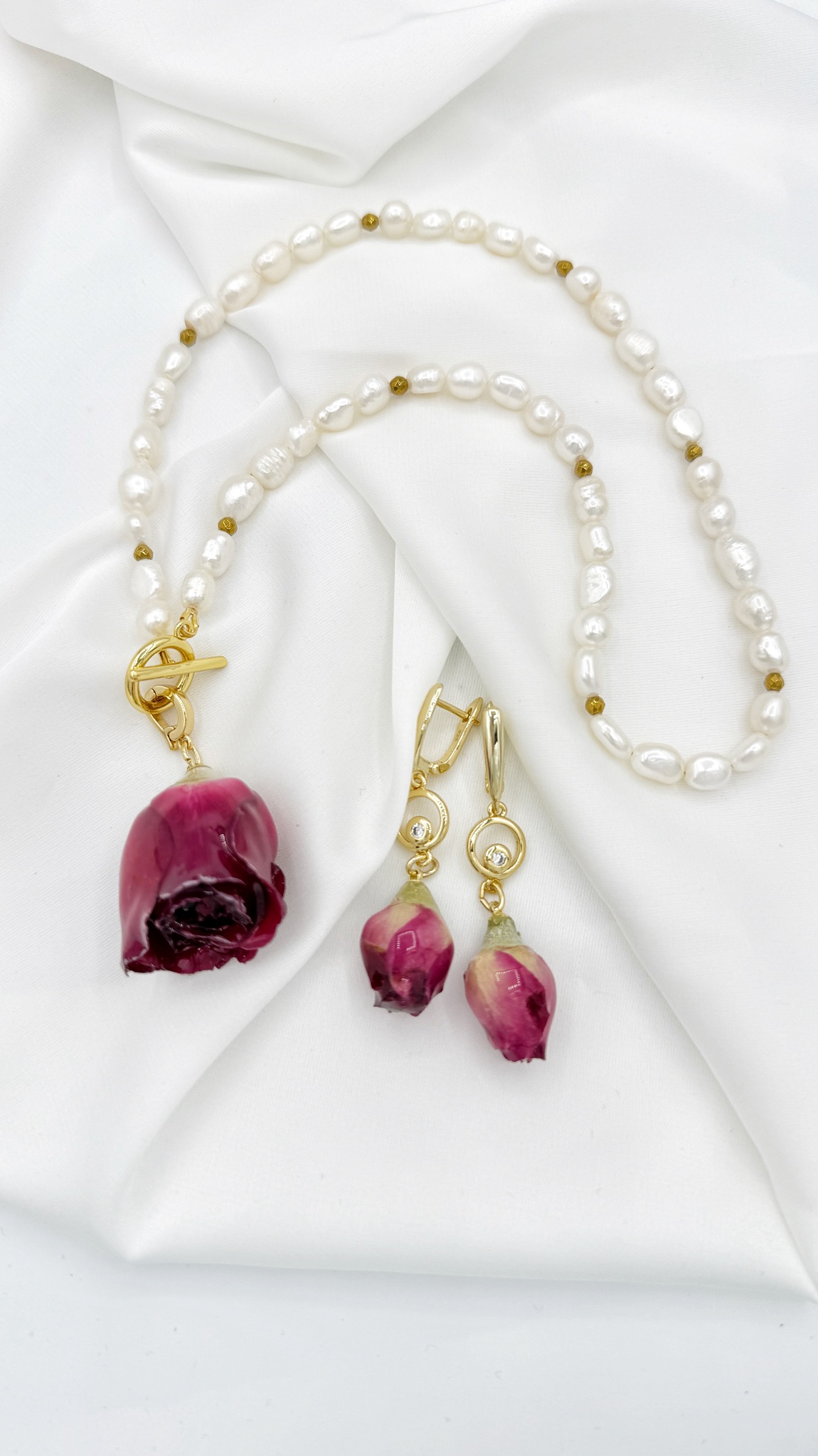 Этот изысканный комплект — тонкое сочетание природной красоты и утончённого стиля. Натуральный барочный жемчуг играет мягким перламутром, каждая жемчужина — уникальна, как и женщина, которая носит это украшение. Акцентная деталь — стабилизированные бутоны роз, бережно покрытые прозрачной смолой, чтобы сохранить их форму и цвет на долгие годы.
