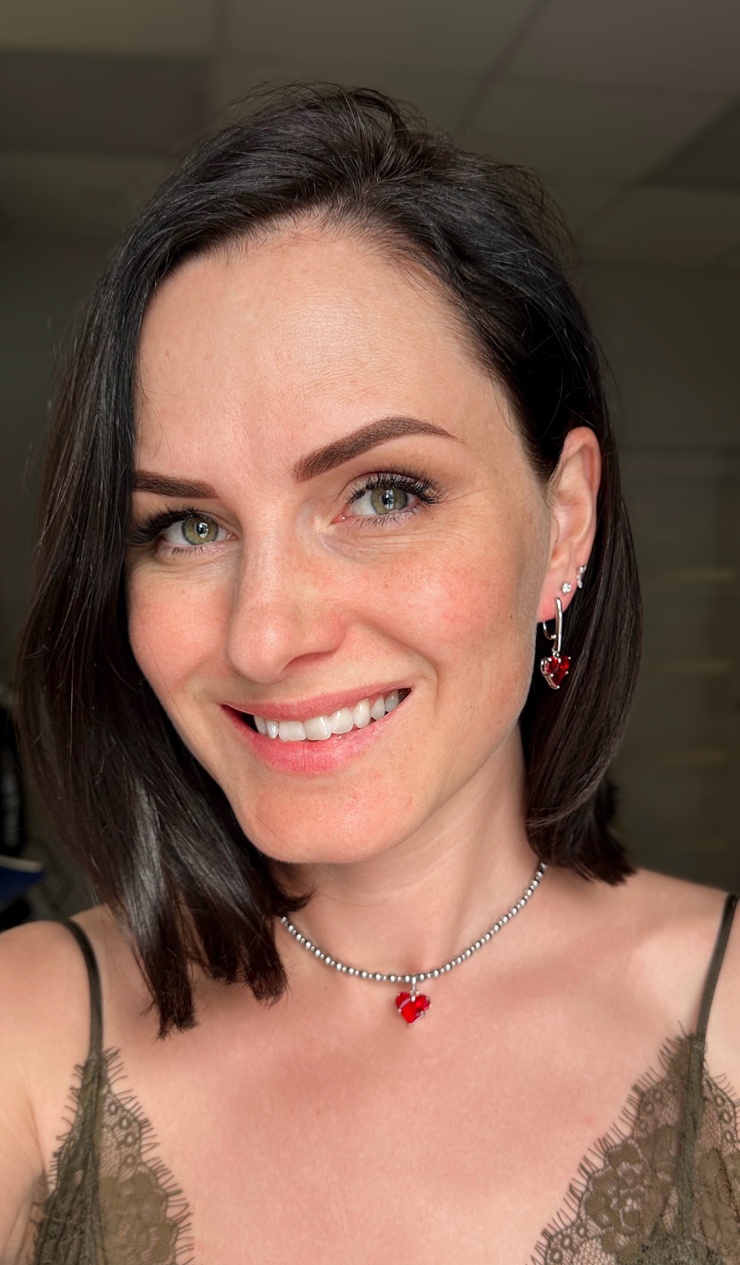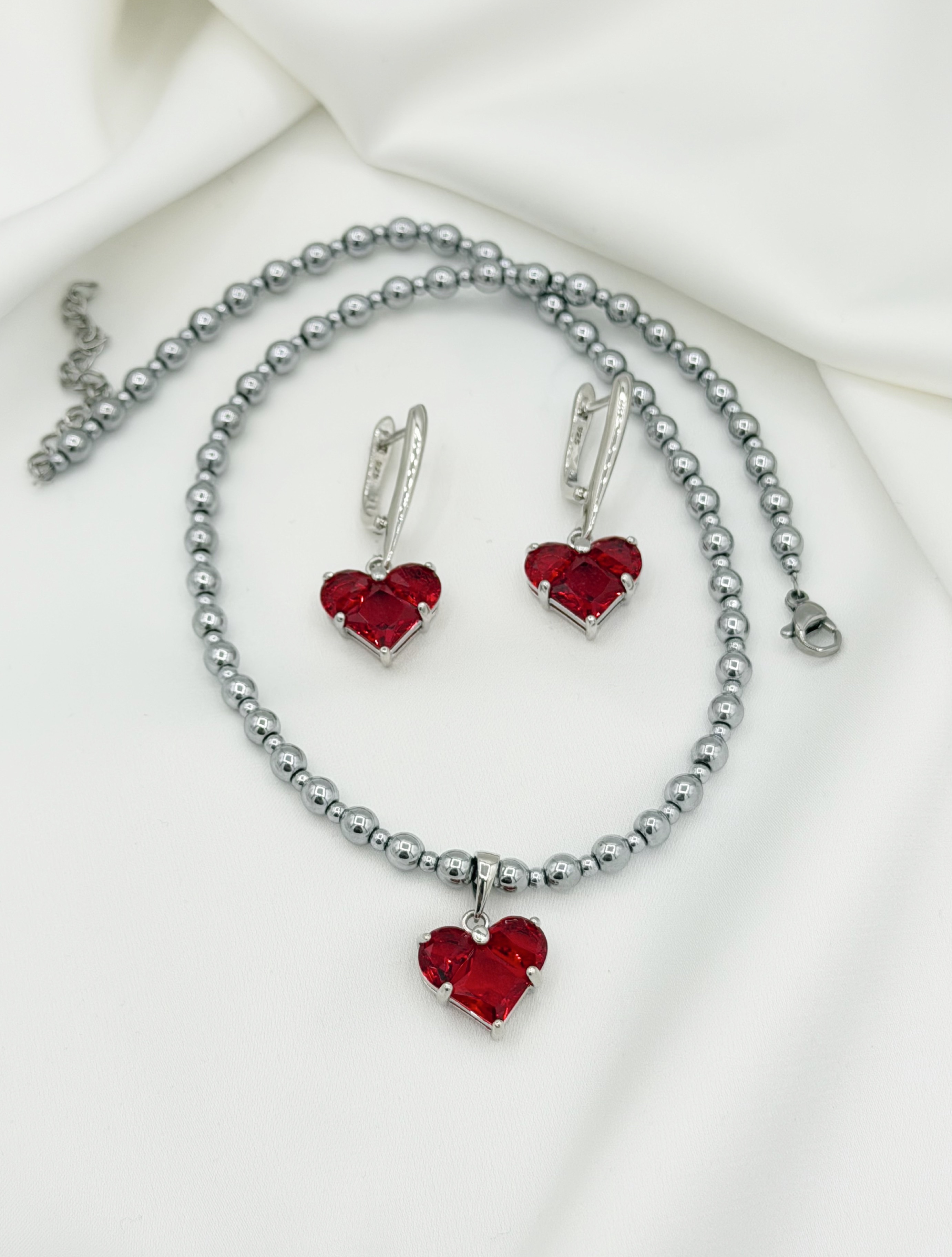 Колье собрано из гематита - камня с благородным металлическим блеском и глубоким серым оттенком. Он придает украшению сдержанную элегантность и современное звучание. Подвеска в форме алого сердца добавляет образу страсть, игру и романтичный характер.
