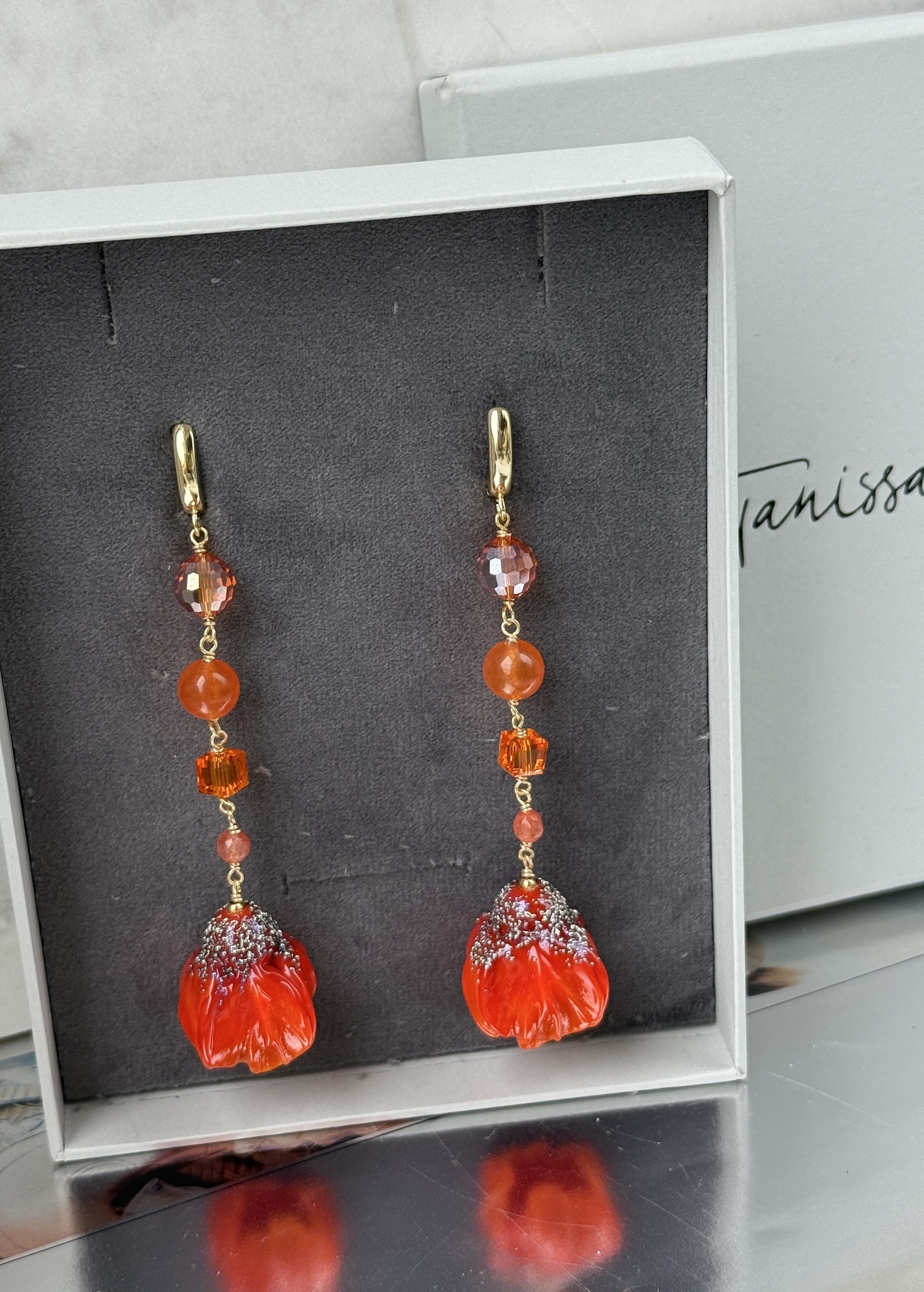 Яркие и изысканные серьги, созданные, чтобы притягивать взгляды. Прозрачные и глянцевые бусины плавно переходят в нежные лепестки оранжевых бутонов, украшенных мерцающими кристаллами. Каждое движение оживляет их огненными бликами — будто в них заключён кусочек закатного солнца.