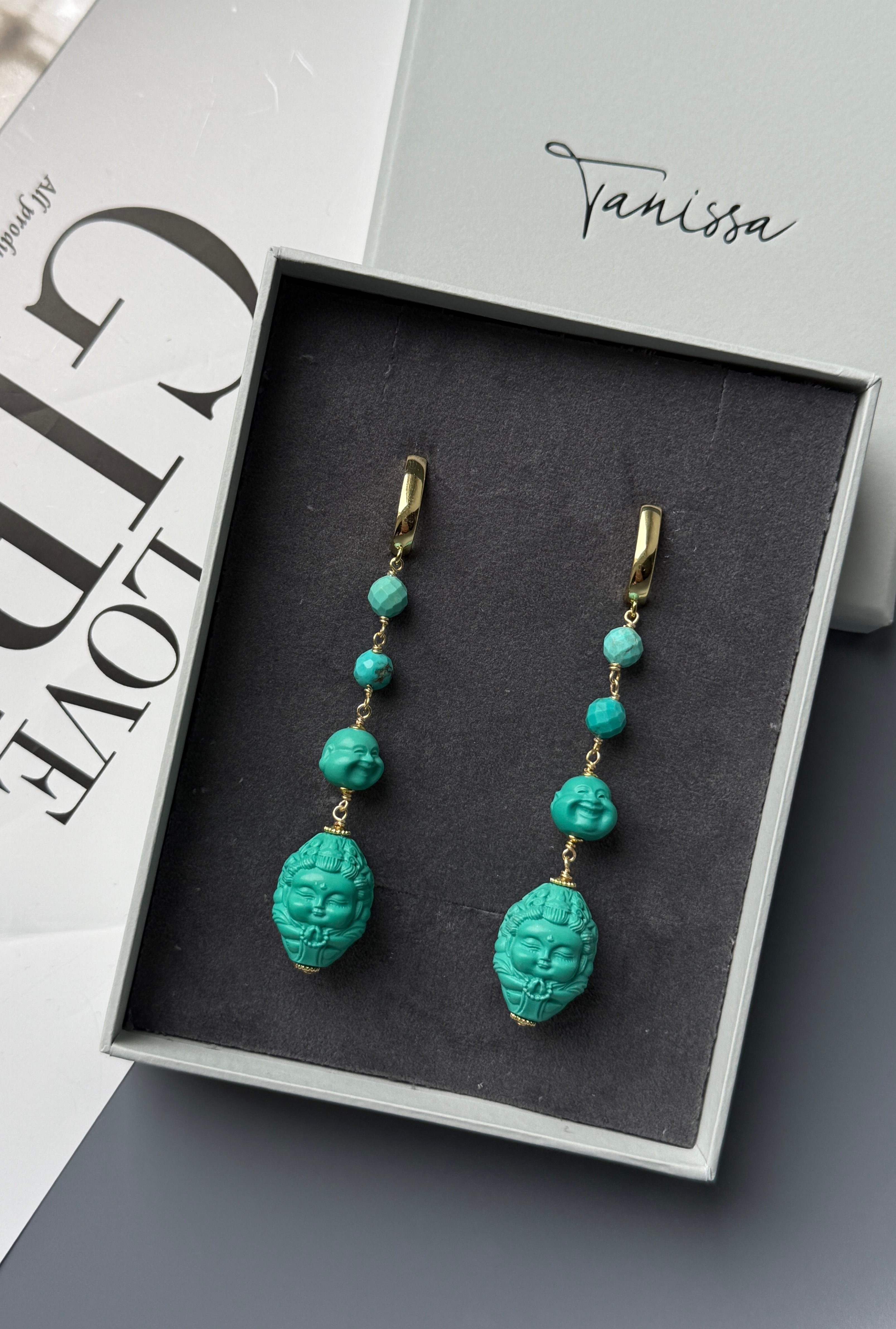 Материалы: натуральная бирюза, укреплённая смолами для сохранения прочности и сияния, латунь с позолотой.